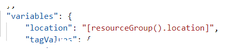 In their simplest form, variables are a key-value pair with the key used to reference the value in a template function. Call the variable template function similarly to the parameters function. The expression “[variables(‘location’)]” is evaluated to the location of the deployments resource group.