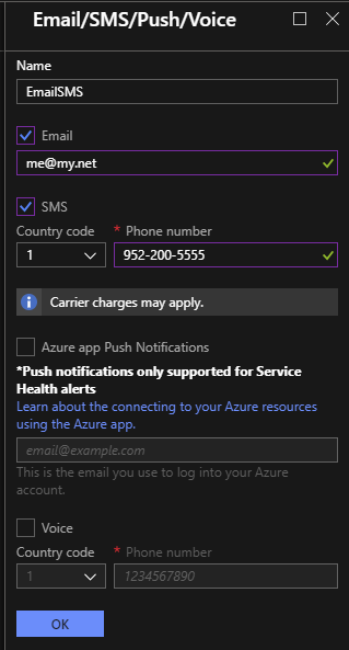 Under Actions, enter EmailSMS or something similar in Action Name. A detail panel will appear. From here, select the Email and SMS check box and enter all relevant information such as email and phone number. Notice you can also add a push notification if you are using the Azure App on a smart phone and some regions can also receive a voice call.